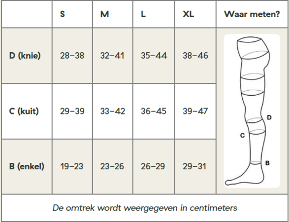 - D = Omtrek onder de knie (dunste gedeelte)